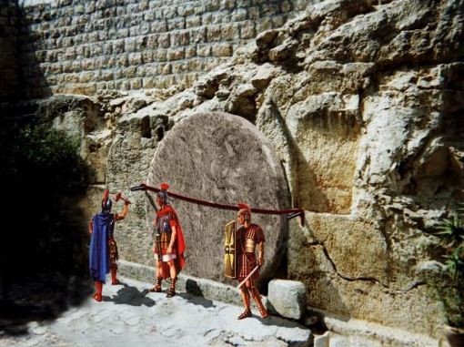 Rápidamente, envuelven el cadáver de Jesús en la larga tela mortuoria y aseguran la mortaja con tiras de tela que anudan en diversos sitios. Ni siquiera lo depositan en un nicho, pues la idea es volver lo antes posible a terminar el trabajo. María se apoya en aquel bulto que es ahora su Hijo, se tapa los ojos con la mano derecha, en señal de oración, y empieza a entonar un salmo a Dios; todos la imitan. Después, es preciso arrancarla de allí. En su dolor, María no entiende que deba dejar a su Hijo tan pronto, pero nuevamente, la insistencia y la ternura de Magdalena obran maravillas con aquella pobre Madre y, finalmente, los hombres pueden rodar la piedra de la entrada y todos regresan a la ciudad, camino del Cenáculo. Nada más irse, una guarnición de soldados herodianos procedente del Templo, que ha estado oculta aguardando, instala allí su campamento, para evitar que nadie se acerque a la tumba, y han sellado la piedra para que nadie la mueva, pues también recuerdan la promesa del Nazareno de resucitar al tercer día y no quieren que ningún discípulo listillo le dé cumplimiento, robando el cuerpo de su Maestro y anunciando, después, que ha resucitado… Aunque, a decir verdad, en su abatimiento, ningún discípulo recuerda ya que Jesús prometiera tal cosa… ¡Sólo María!