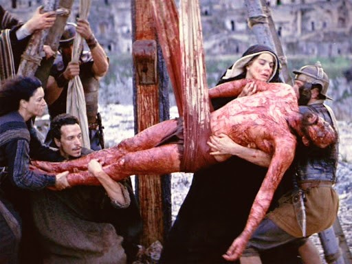 Todavía continúa aquella luz mortecina que todo lo envuelve, pero la explanada del Calvario está vacía, todo el mundo ha ido a refugiarse en sus casas, incluida la guarnición romana; sólo unas poca figuras permanecen en escena, los tres crucificados y algunos discípulos de Jesús, incluida su Madre. Ya no se oyen voces vejatorias ni risotadas obscenas, tan sólo el ulular del viento entre las cruces y algunos sollozos entrecortados de las mujeres. En verdad que la Pasión de Jesús ha sido terriblemente dolorosa…; también para los suyos, especialmente cuando fue vista por los ojos de una Madre. Para Jesús ya todo pasó, pues, una vez muerto, ya no sufre más; sin embargo, no podemos decir lo mismo de los que quedan en pie, con sentimiento de orfandad, especialmente de aquel guiñapo de mujer que se retuerce, ahora, de dolor y de impotencia a los pies de la cruz, pues ya no le quedan más lágrimas, aquella cruz le ha quitado todo lo que más quería en el mundo, su Hijo único. Ahora, sólo espera que le devuelvan lo que de Él quedó.